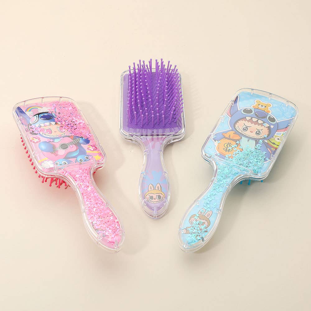 Size : 2.6" X 7.75" This adorable paddle hair brush features playful character art and floating glitter accents that make styling fun. Its wide bristle layout helps glide through hair smoothly while adding a cheerful touch to any routine. A delightful accessory for daily grooming and gifting.