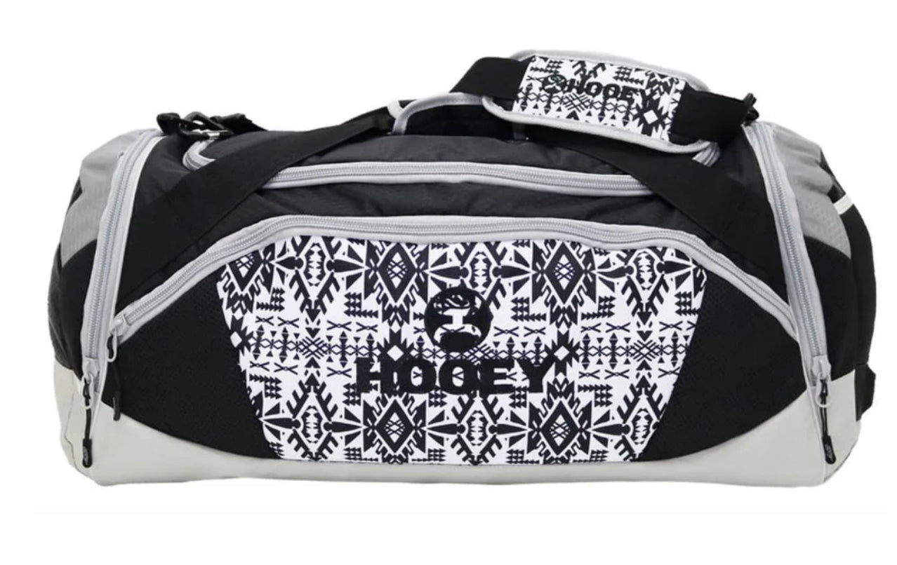 Check out the Hooey Competitor Tan Aztec Duffel Bag DB001TNNV. Featuring a top zipper closure, two side pockets, and a front pocket, this bag offers ample storage space. It also includes an adjustable shoulder strap, top handles, and a stylish brown design with logo on the front. The serape striped print adds a trendy touch. Imported. Style: