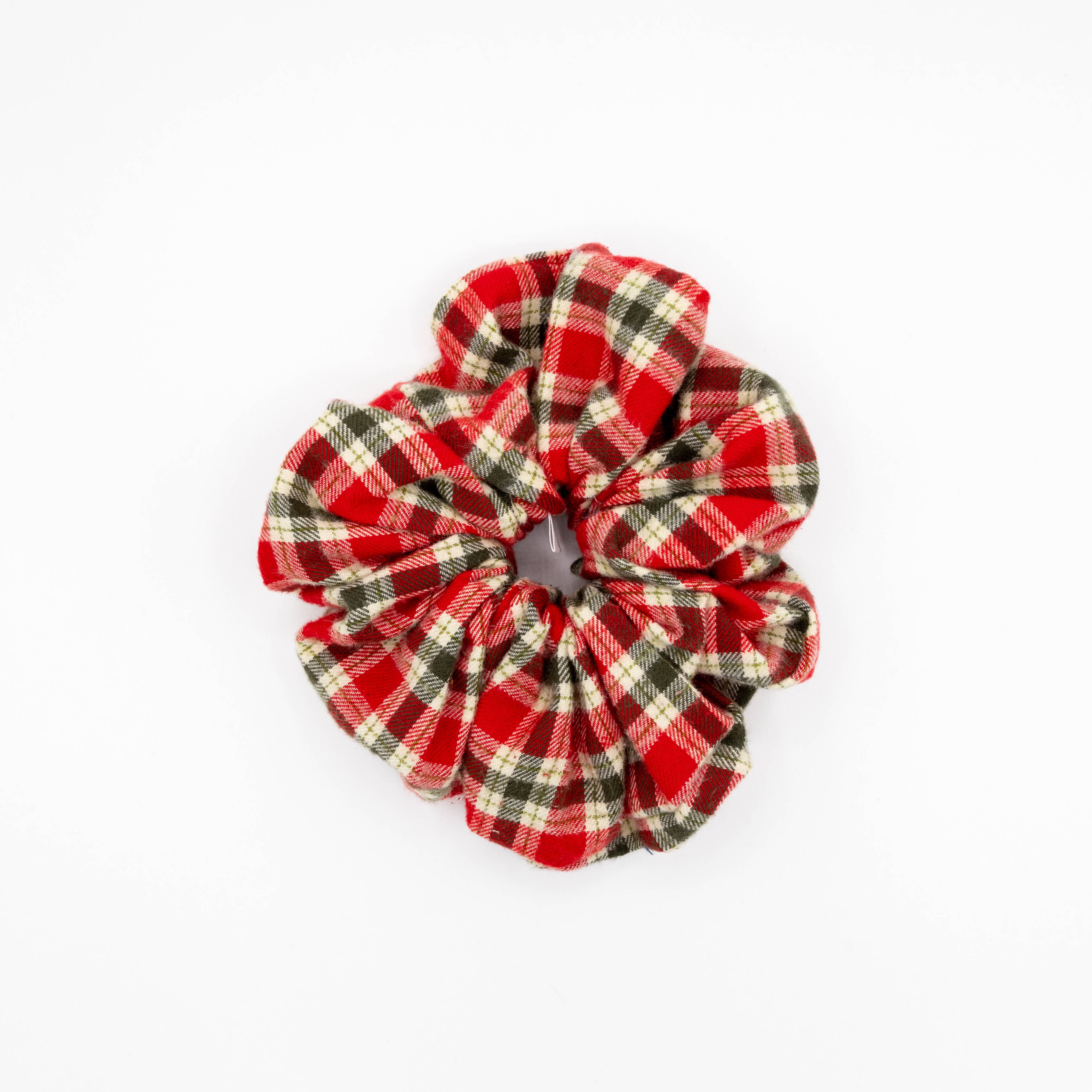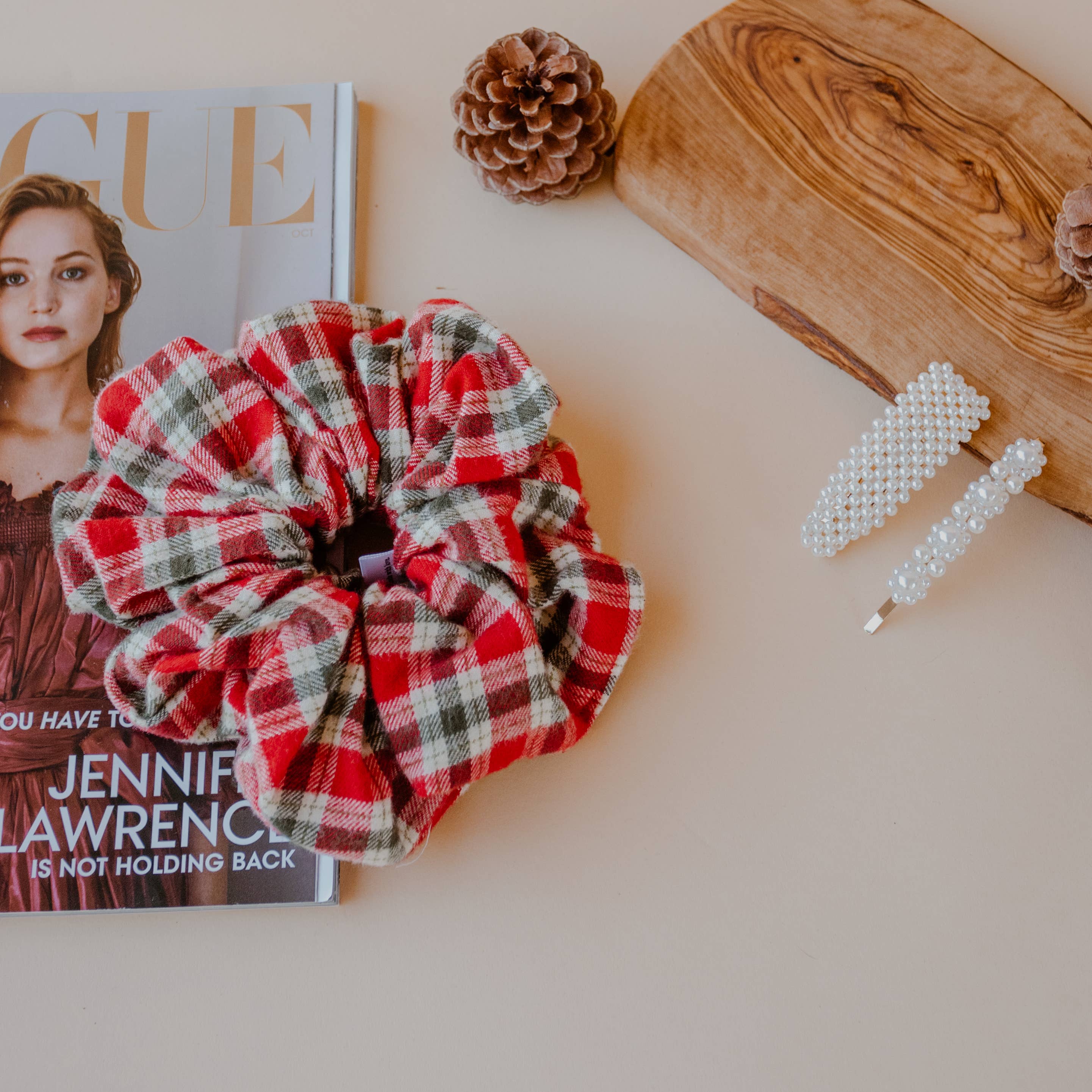 Flannel Scrunchie Collection Stay stylish this fall with our flannel scrunchies. We use 3/4" elastic in our XXL Scrunchies, making them perfect for any hair type. Thick hair approved! Check out the entire flannel Scrunchie Collection in our shop! Color Description: • Ava - Green/ Red Content: • 100% Cotton • Handmade in Los Angeles Size: • Approximately 7" in diameter • Wraps approximately 2x around hair • Elastic approximately 7" - 8”