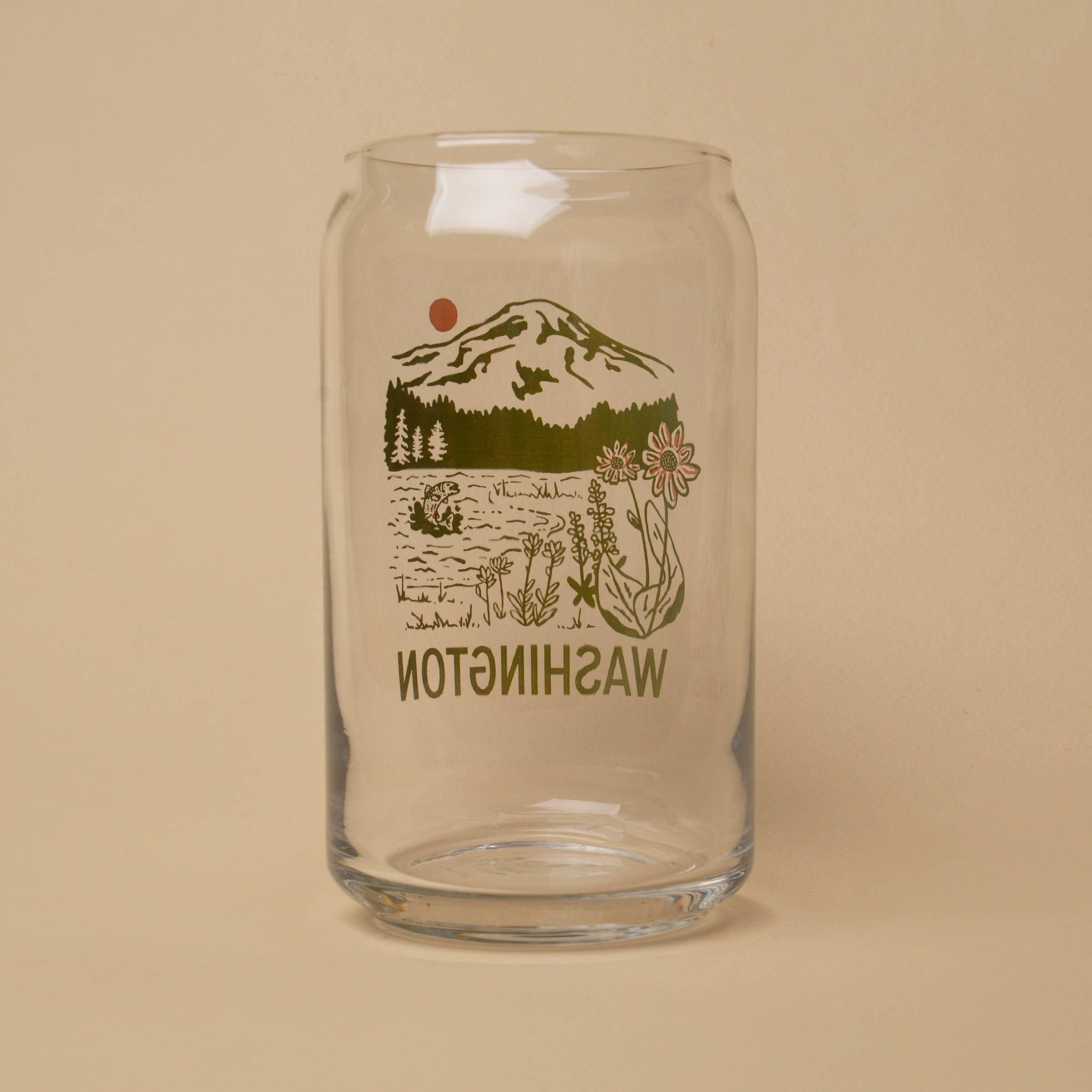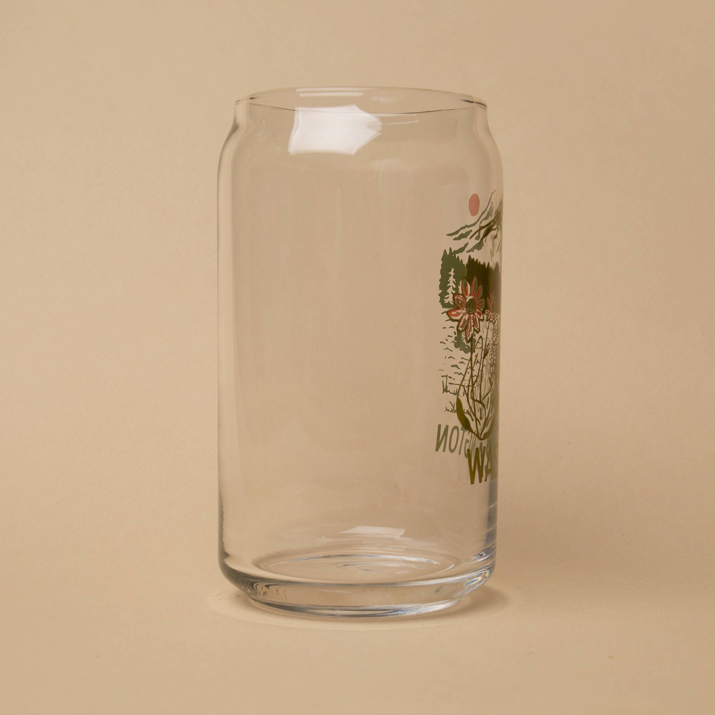 16 oz screen printed, beer can glass. Designed in Portland, Oregon. Seattle Tacoma Olympia Spokane Vancouver Bellevue Bellingham Port Angeles Forks Washington Mountain Mountains Mount Mt Rainier Helens Lake Forest Trees Evergreen State WA PNW Pacific Northwest Water River Hike Hiking Camp Camping Nature Outdoors Wild Wildflowers Flowers Alpine Fish Trout Fishing Summer Spring Fall Ski Snowboard Travel Beer Can Glass Pint Pints Cup Glassware Souvenir Gift Spring Summer