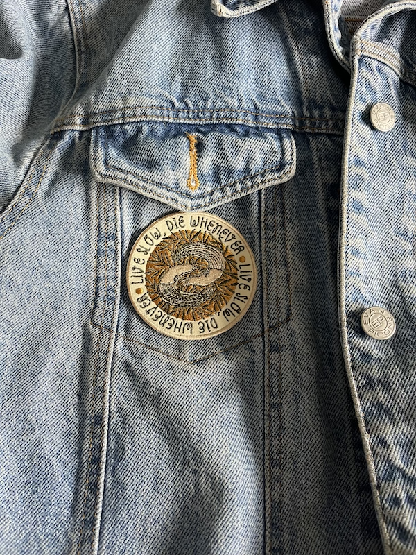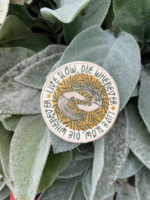 Another awesome patch to add to your collection! This 3" round patch features two banana slugs and the words, "Live Slow, Die Whenever" circling around the edge, embroidered in green and yellow thread. It features an iron-on backing for easy application. Put it on your favorite jean jacket, bag, beanie, or gift it to a slow living, slug-loving friend. // DETAILS: • 3" round embroidered patch • iron-on backing for easy application (comes with instructions!) • lovingly packaged in a cellophane bag and a sturdy mailer // IRON-ON PATCH INSTRUCTIONS: • Lay your chosen garment on a flat surface. • Turn on your iron and set to correct heat for garment type. Make sure steam is turned off. • Place the patch (face up) onto your garment in the chosen place. Place a thin cotton cloth over the patch. • Apply pressure with the iron in circular motions for 10-30 seconds. Allow patch to cool, then flip the garment over (or inside out) and apply direct heat with the iron for 30 seconds.
