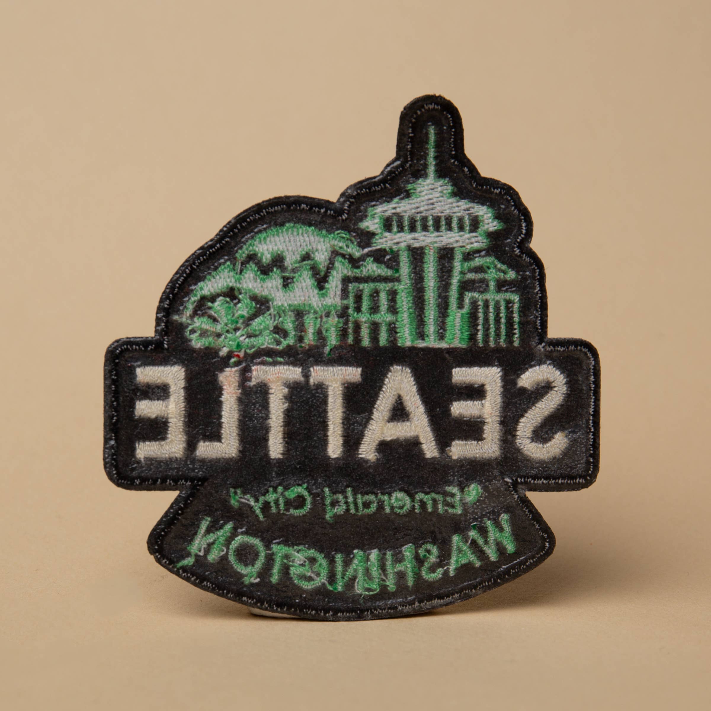 3.08"w x 3.25"h embroidered patch with iron on backing Designed in Portland, Oregon Seattle Washington WA State City PNW Pacific Northwest Cascadia Cascades Emerald City Evergreen State Space Needle Ferris Wheel Skyline Cityscape Overlook Mount Mt Rainier Patches Iron On Sew On