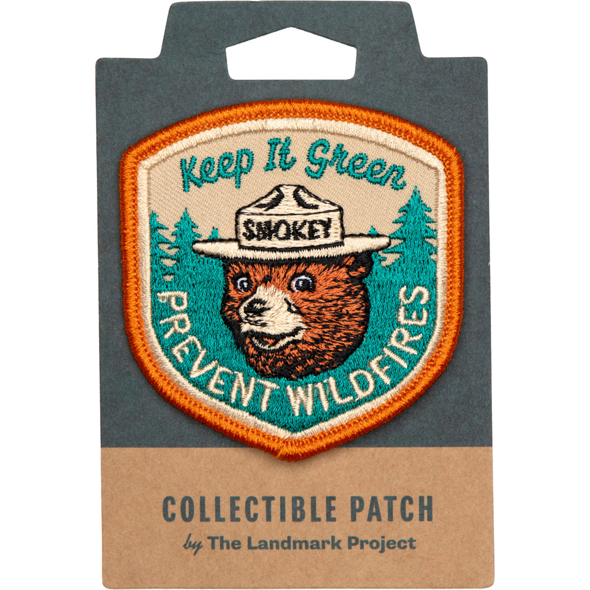 Keep our forests green and join forces with Smokey Bear to protect our them from the threat of wildfires! Our 'Keep it Green' Patch, adorned with Smokey's wise and determined face, is a powerful reminder of the crucial role healthy green forests play in fire prevention. As an official licensed product, 10% of each sale goes back to the USDA Forest Service for wildfire prevention education. Thanks for helping Smokey Bear! Each patch has an iron on backing, making it easy to apply. Quick Specs: Patch Backer- 3"x4.5" Patch Dimensions- 2.5"x2.7"