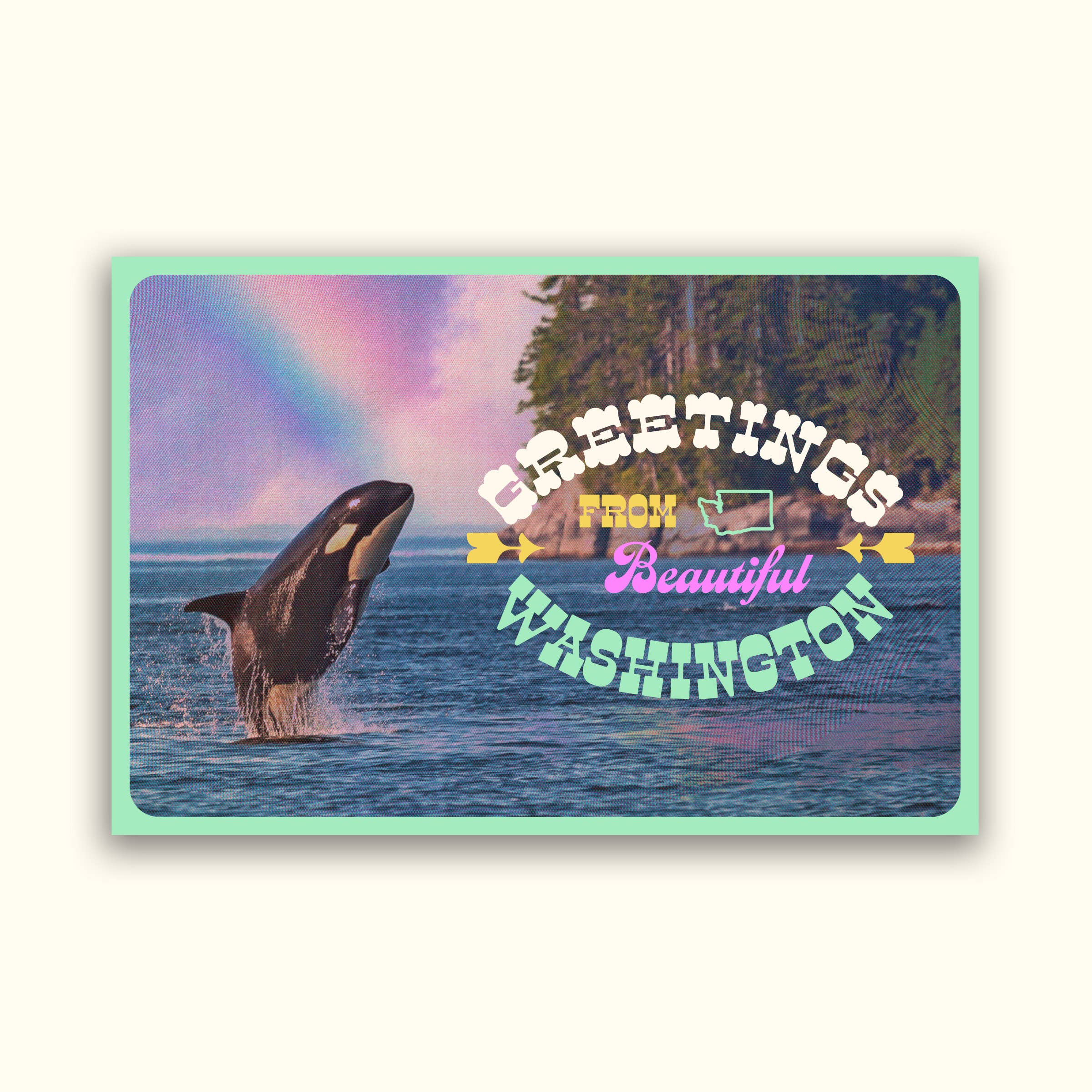 4x6" postcard, locally designed & printed in Portland, Oregon. Washington State Symbol Icon Orca Killer Whale West Coast Seattle Tacoma Olympia Spokane Vancouver Bellevue Bellingham Port Angeles Forks Emerald City Evergreen State PNW Olympic Ocean Puget Sound Pacific Northwest Salish Sea Postcard Mail Letter