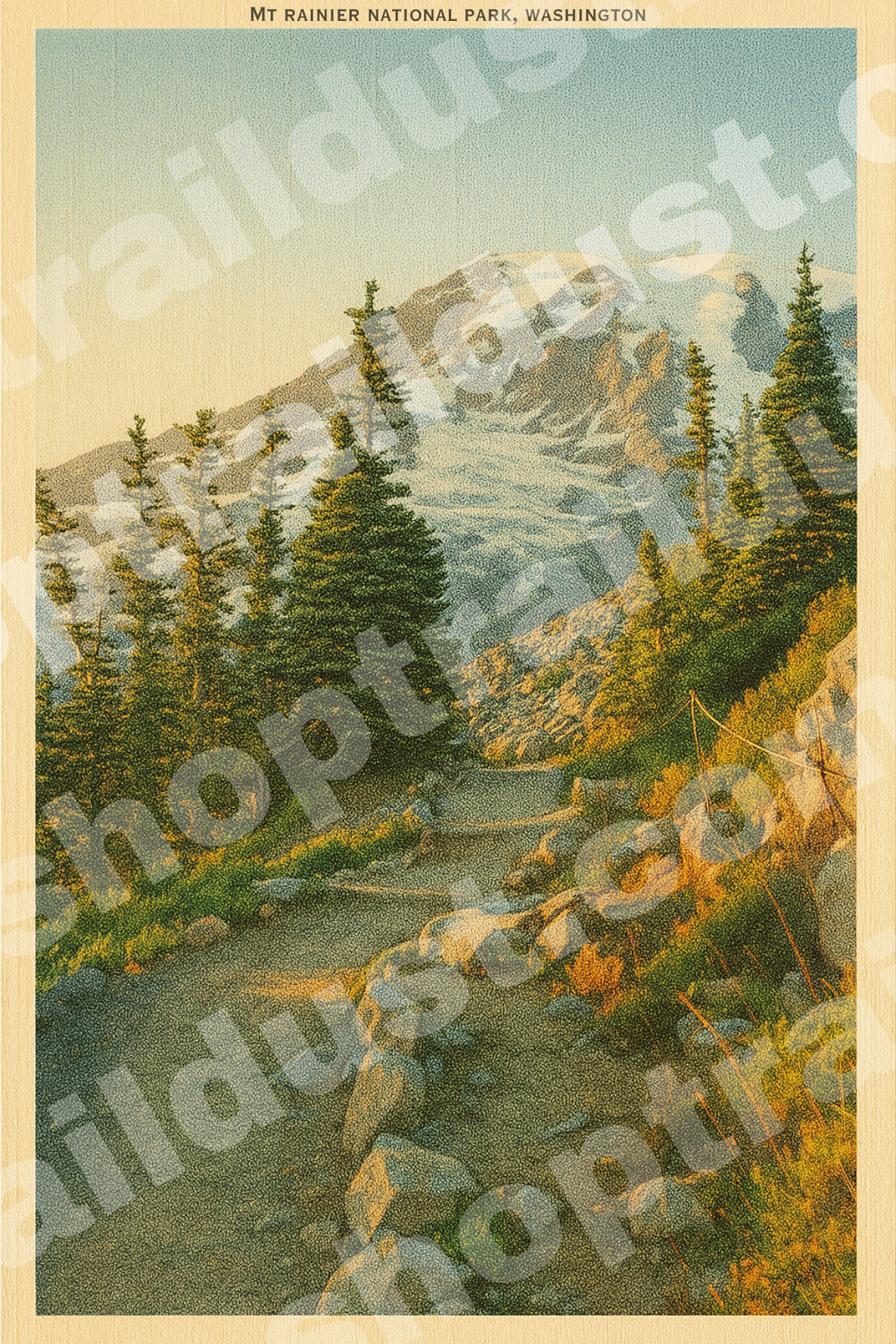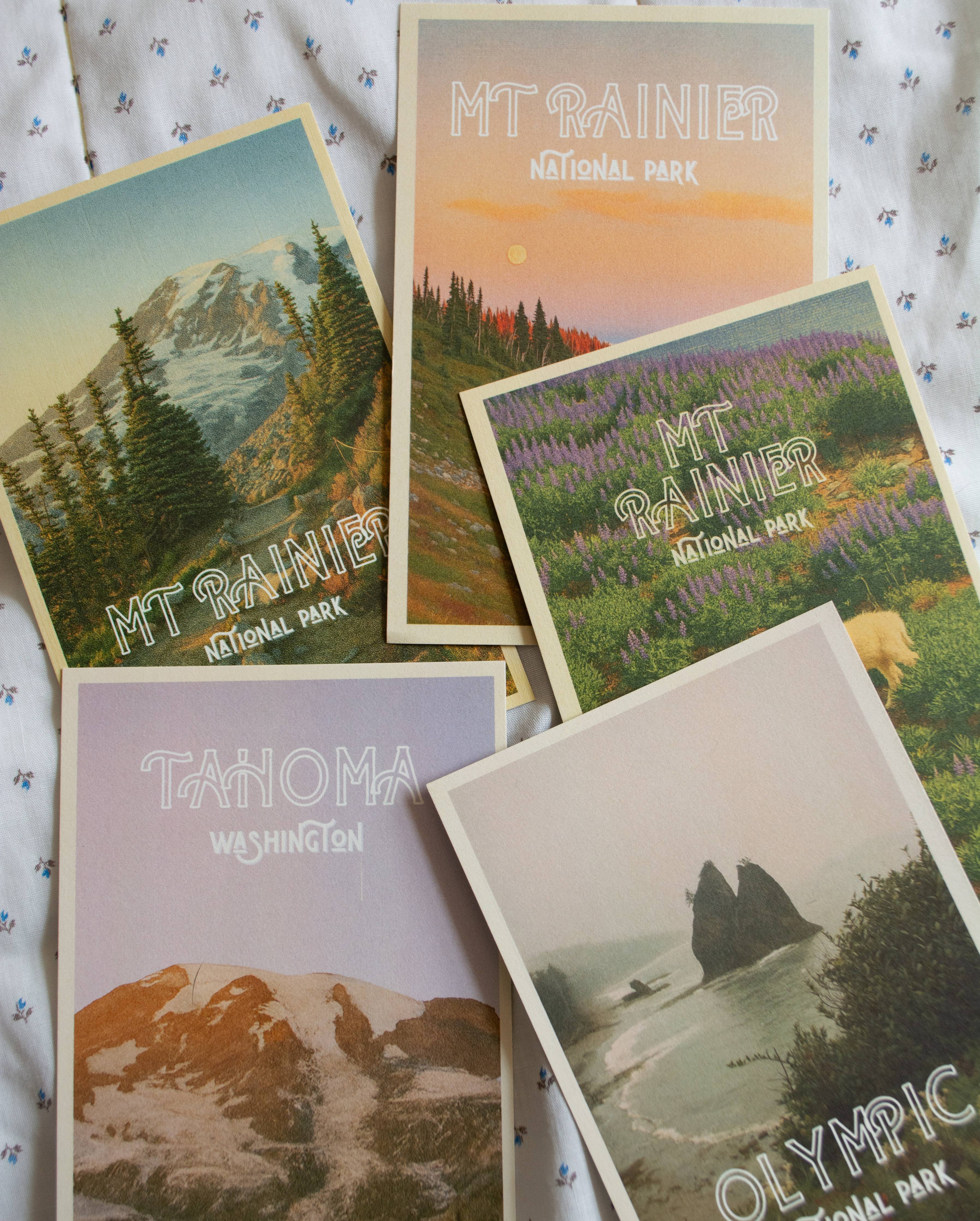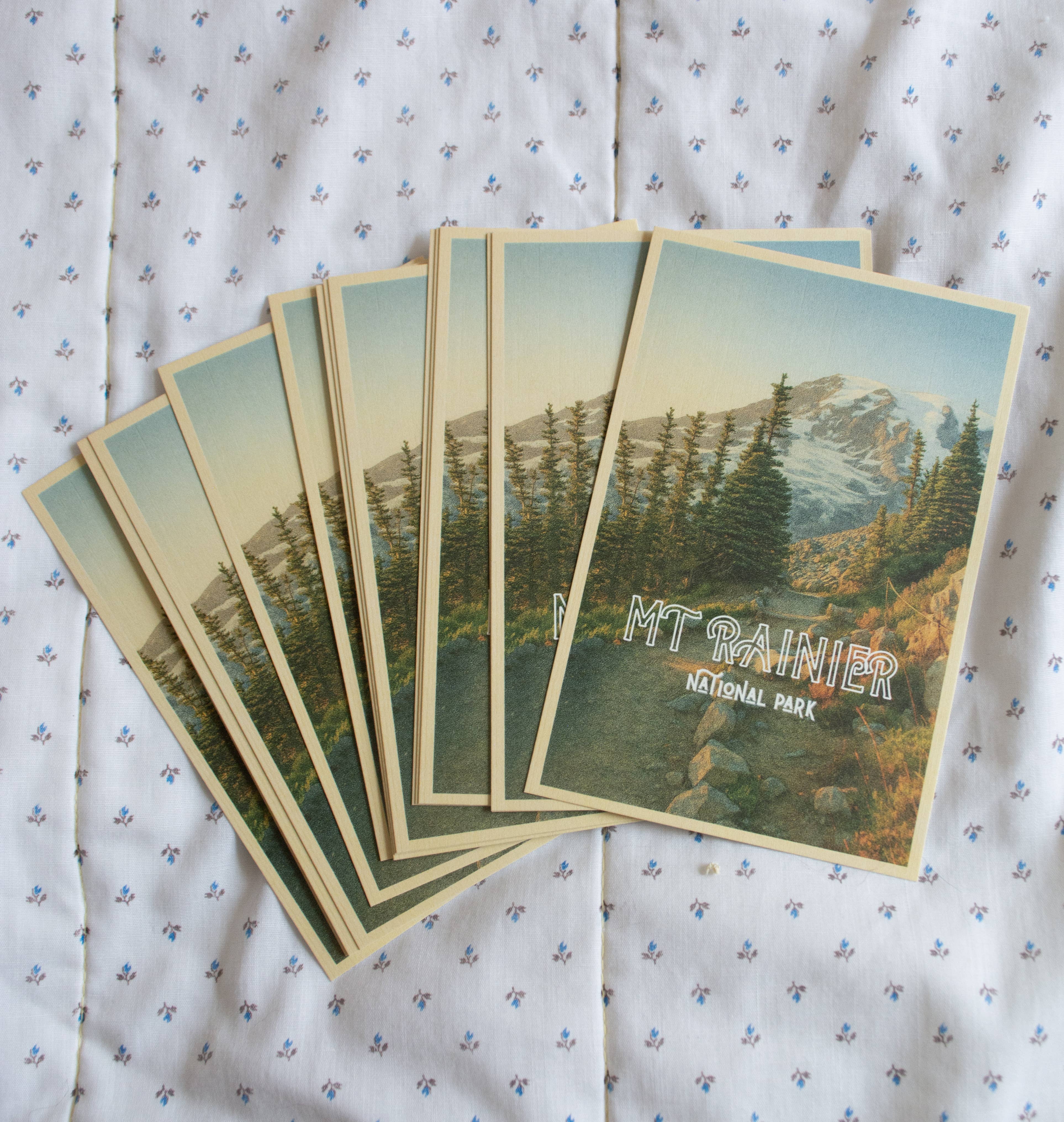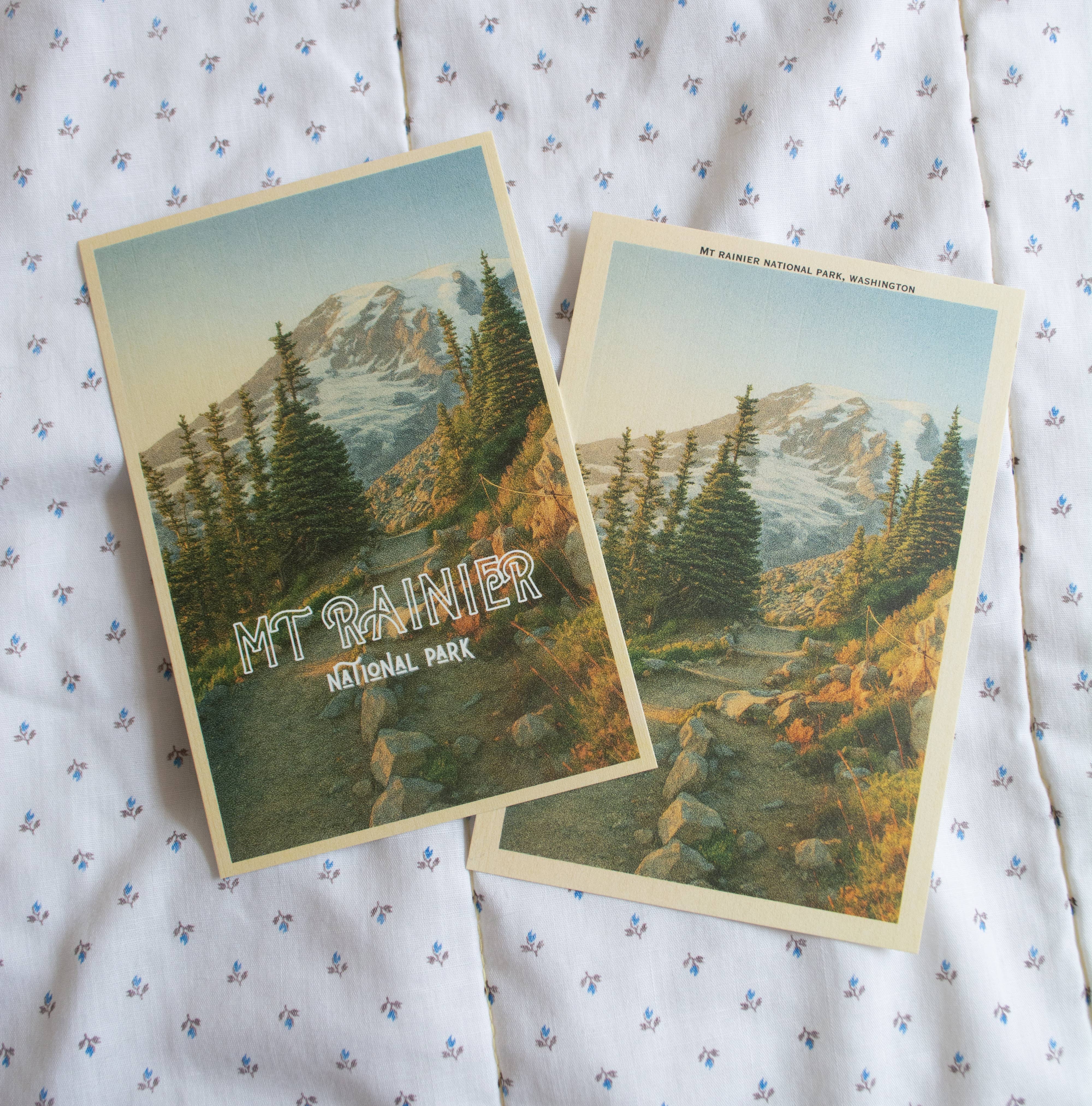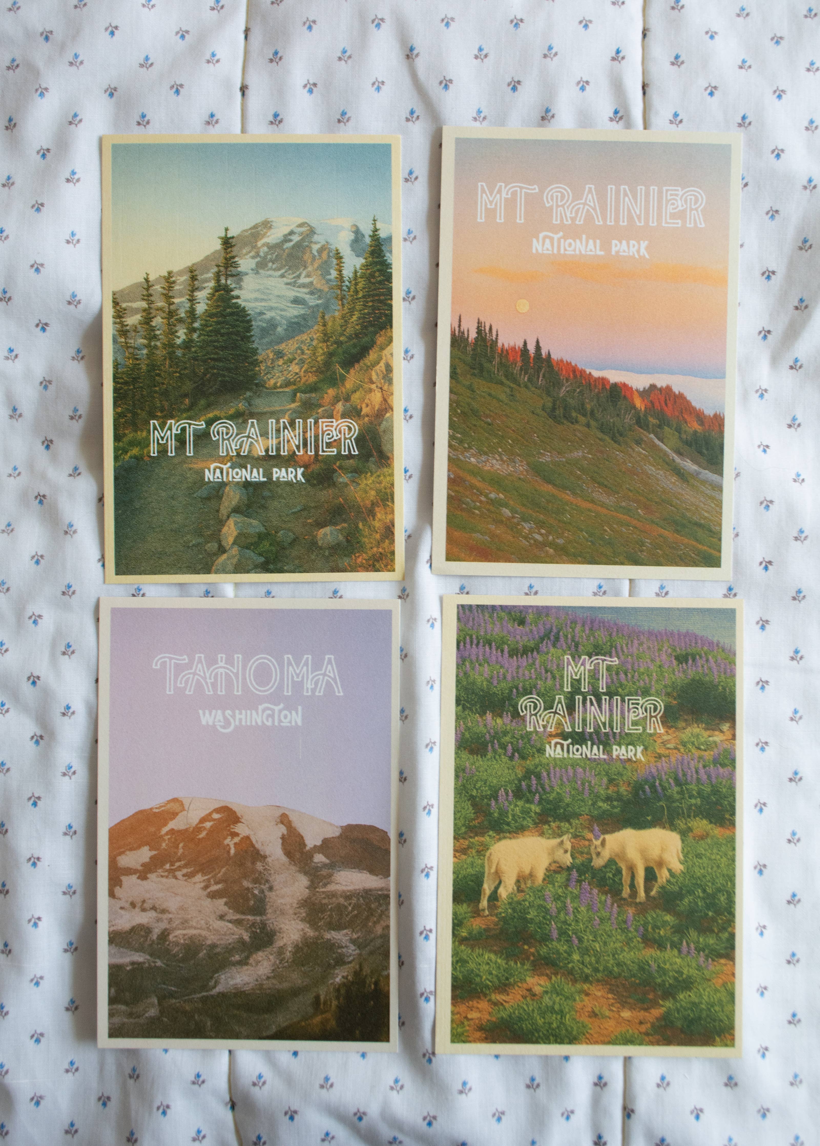 Our products are inspired by the linen postcards of the late 20th century. It features our original photography of Mt Rainier.