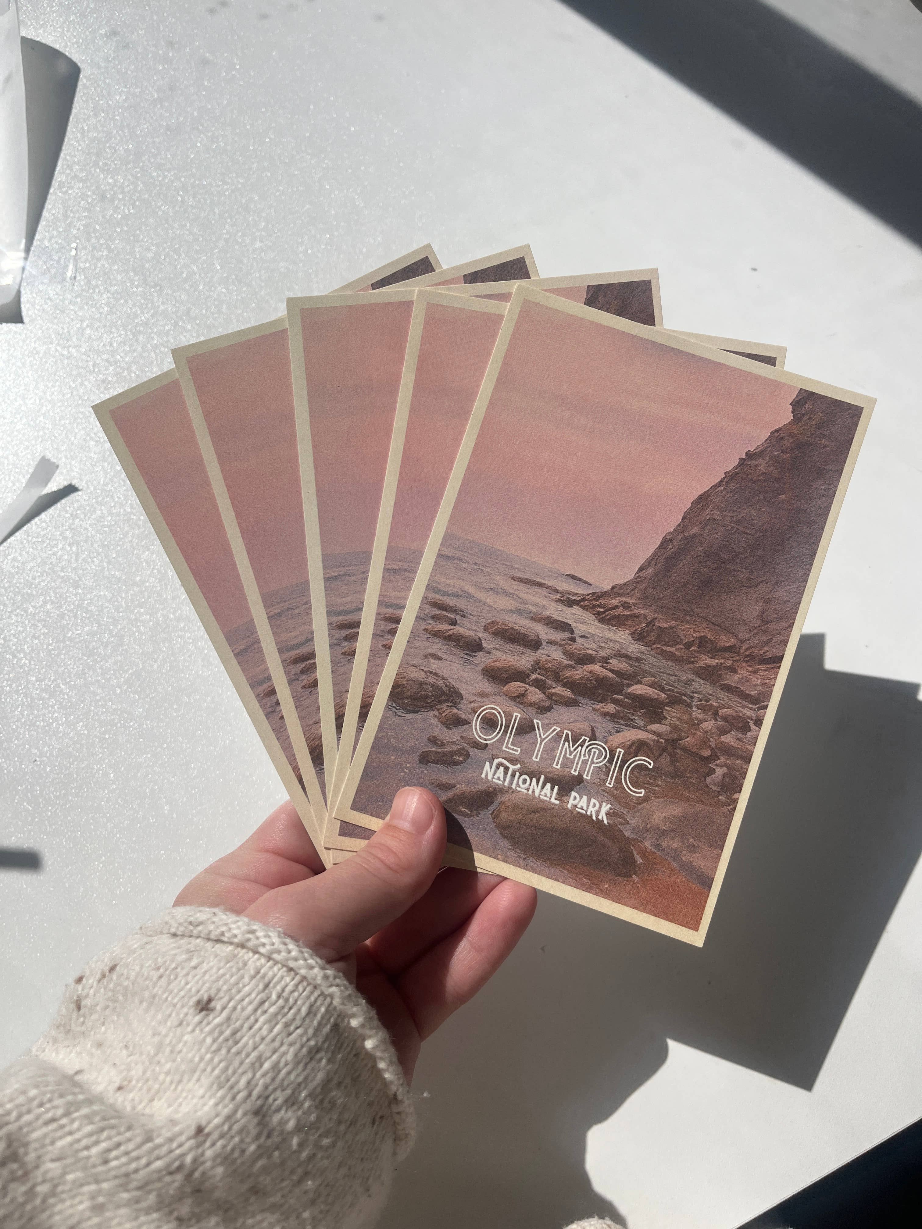 Our products are inspired by the linen postcards of the late 20th century. It features our original photography of Rialto Beach at sunset.