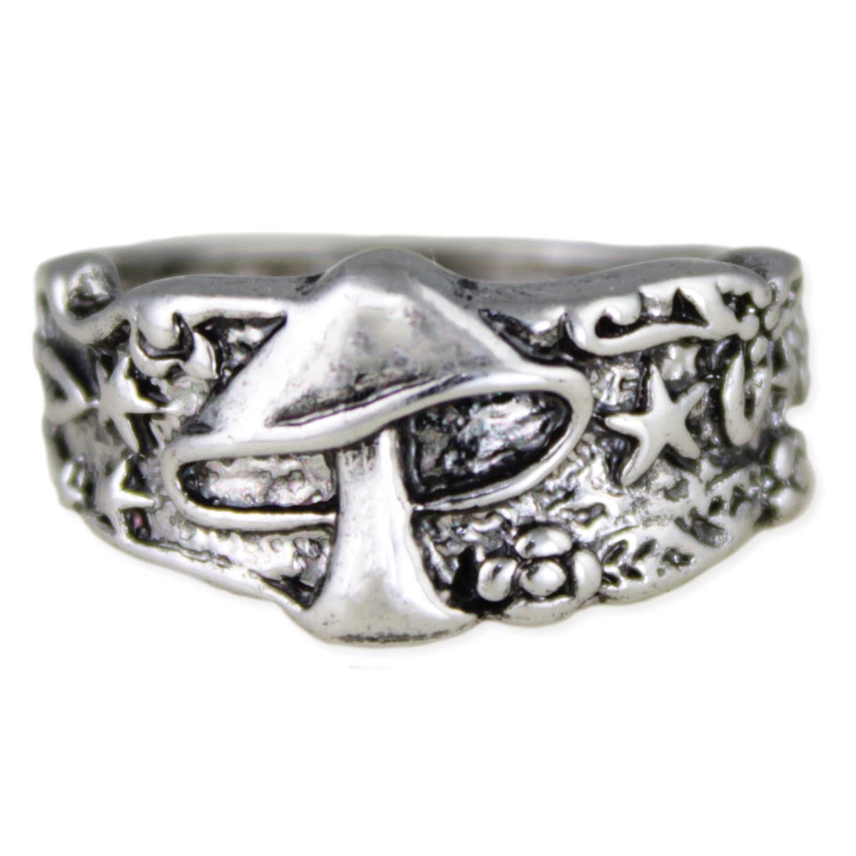 This rustic handmade look mushroom ring has vintage appeal. Antiqued silver band ring features toadstool center with star accents. Nature inspired ring with sweet mushroom design. * Made in China * Silver vintage toadstool band ring