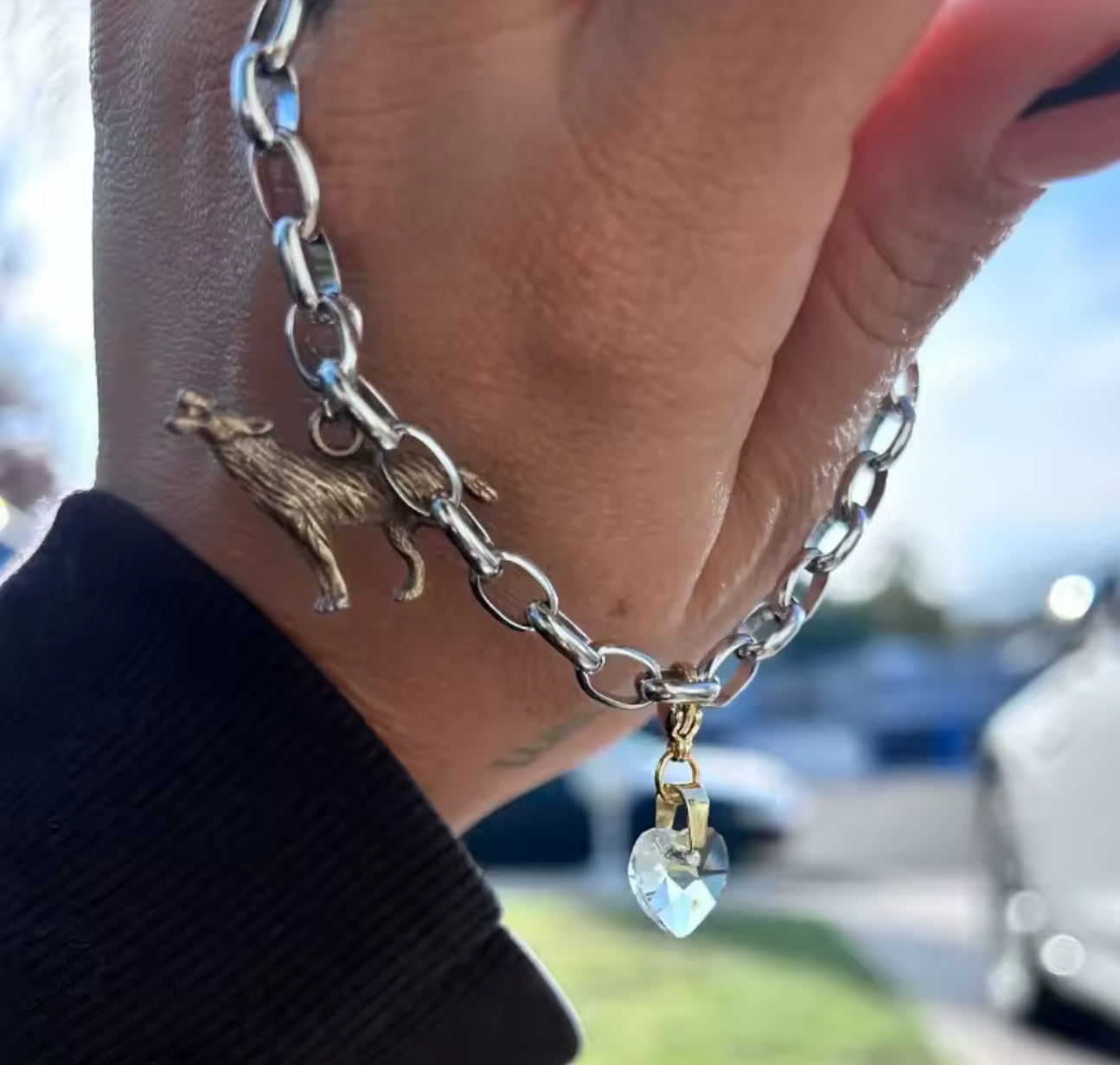 Our Twilight Bella's Wolf/Heart Bracelet is a replica of Bella's bracelet from the Twilight Movie, Eclipse. The wolf charm is made of alloy and the heart is a 10mm acrylic crystal. The rest of the bracelet made of stainless steel.