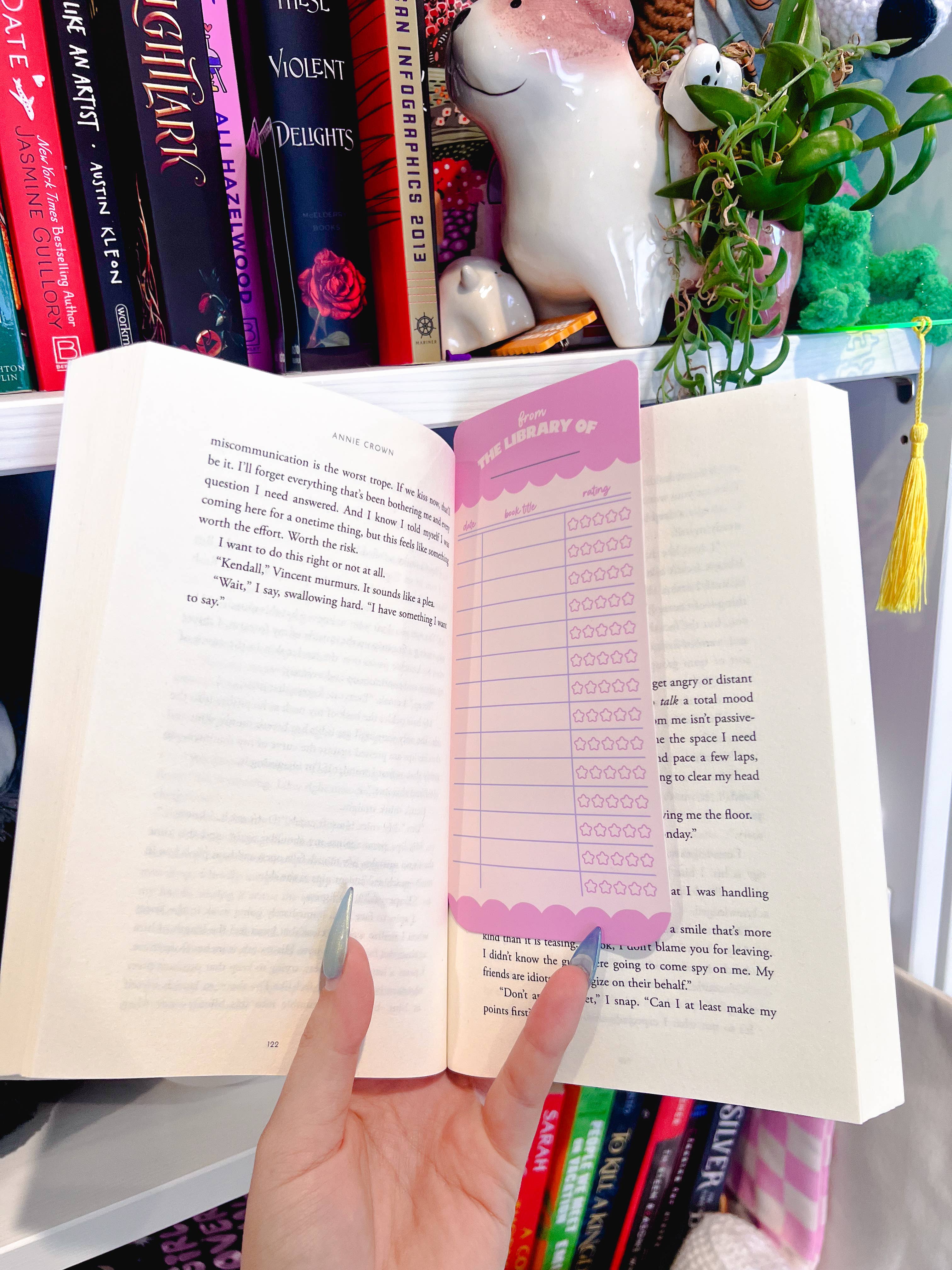 Double sided bookmark with spots to write down the books you have read and a star rating for them! Comes in 3 different colors! Pink, Green and Periwinkle Dimensions: 3in x 7in