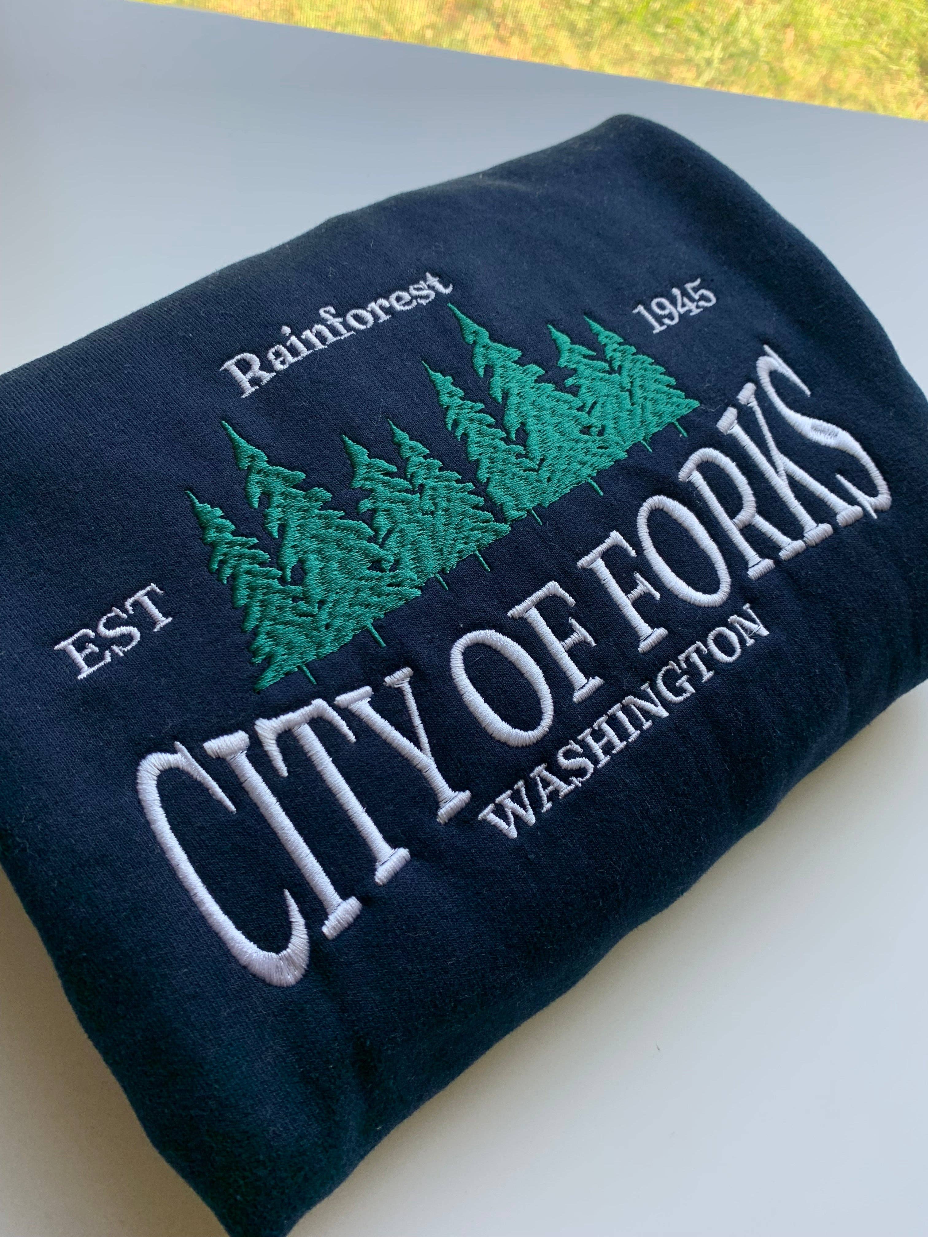 Description: Embrace the mysterious allure of the Pacific Northwest with our City of Forks Embroidered Sweatshirt! Perfect for fans of the Twilight saga and lovers of the enchanting town of Forks, Washington.