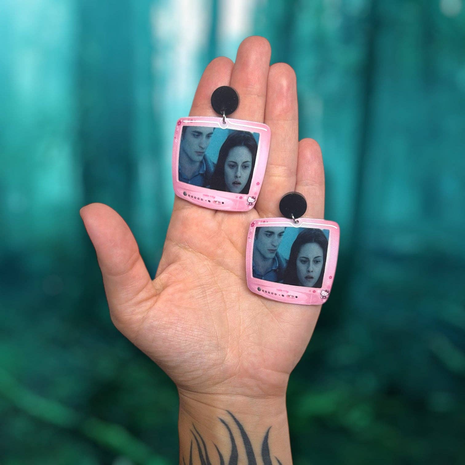 𝔖𝔞𝔶 𝔦𝔱...𝔬𝔲𝔱 𝔩𝔬𝔲𝔡. 𝔖𝔞𝔶 𝔦𝔱! Twilight Bella Swan and Edward Cullen forest scene sparkly vampire Hello Kitty TV statement earrings • 1.75" tall • made of machine-cut, lightweight, PVC polymer • sealed with clear, glossy resin • finished with glittery black resin cabochons • hypoallergenic, stainless steel stud post backings (hardware swaps available upon request!) Due to the handmade nature of my pieces, please allow for slight variations in color or size!
