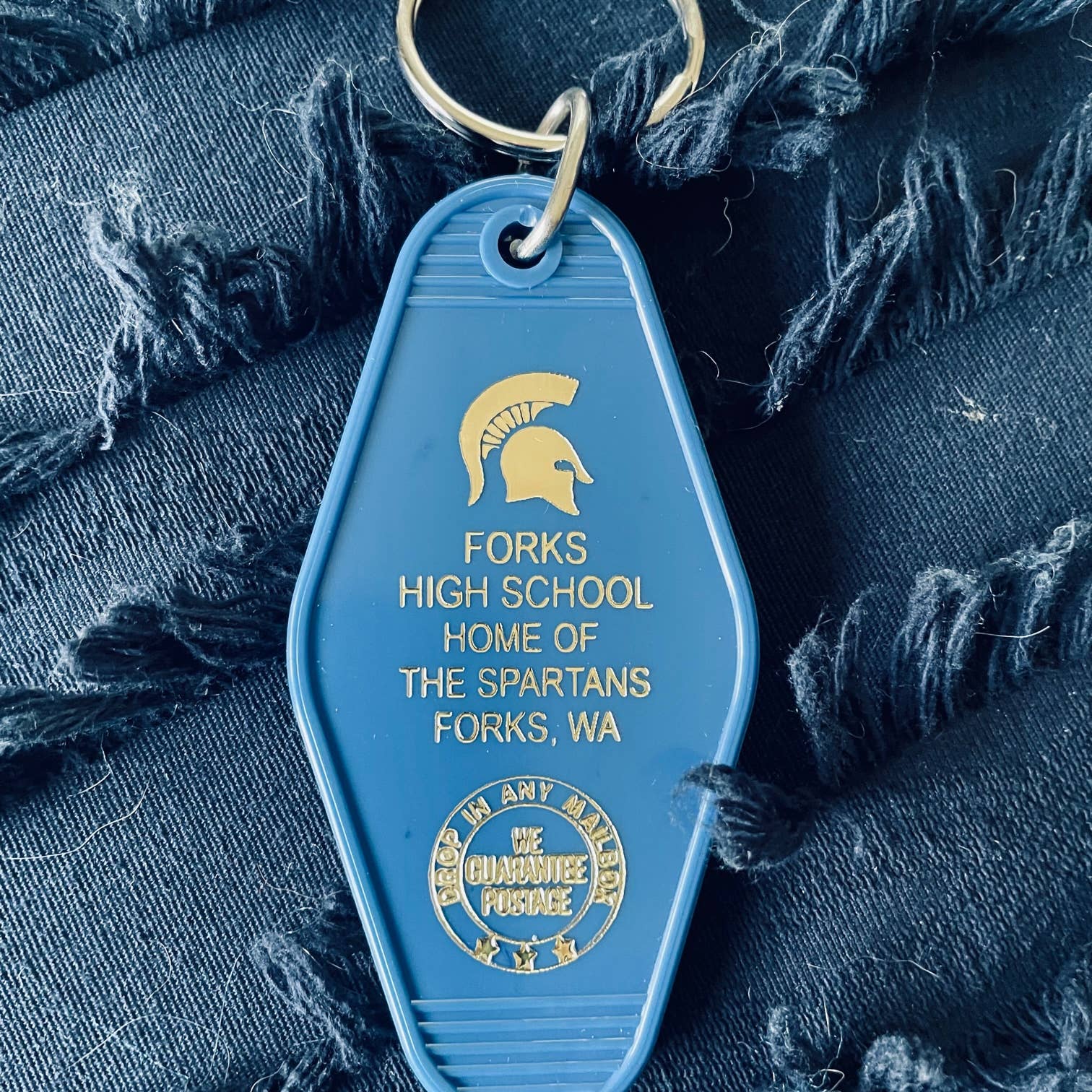 Vintage style motel key fobs, complete with 32 mm slip ring, featuring the High School where all the sparkly vampires attend. NEWS FLASH!! We are now doing our own in house injection molding for the plastic fob. What that means is this is 100% Made In America, and we have more color options. We have also added an additional ring to the fob so that it hangs flat!