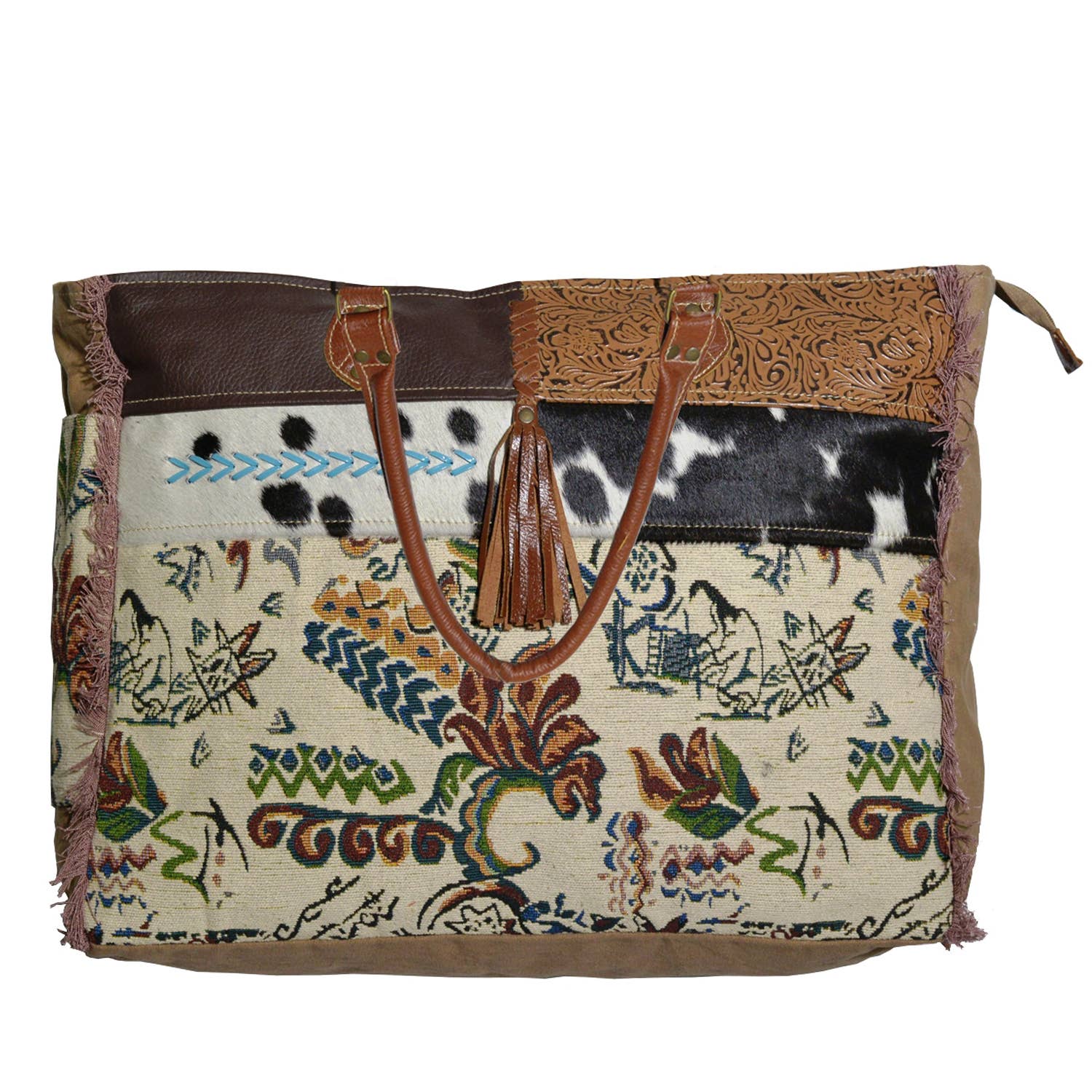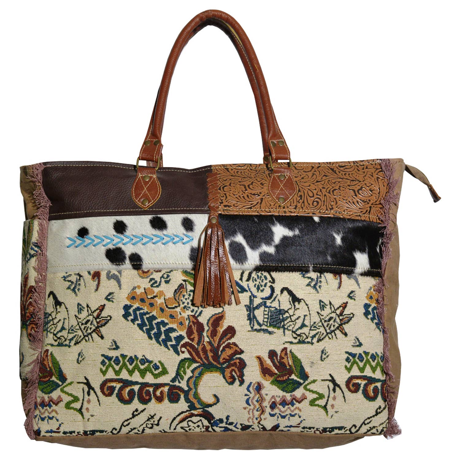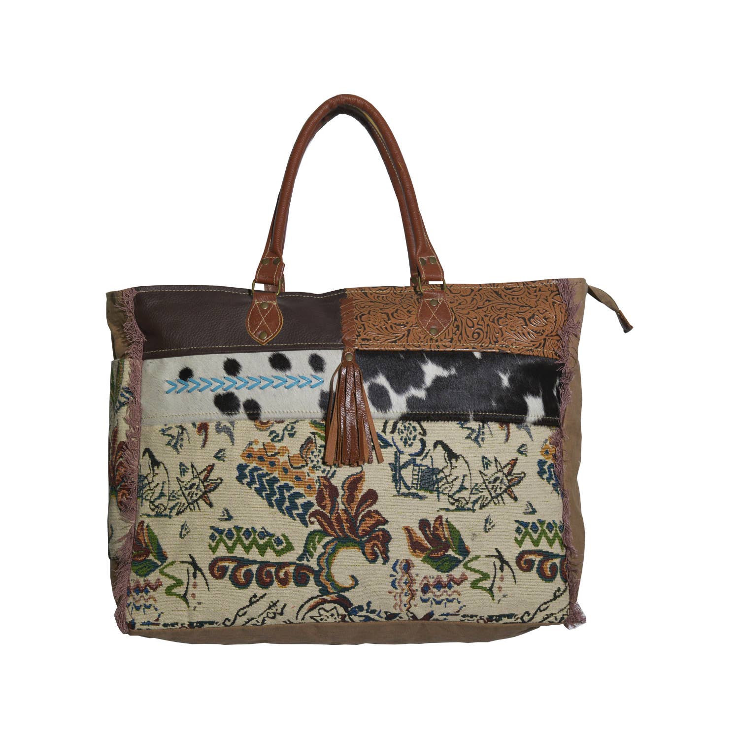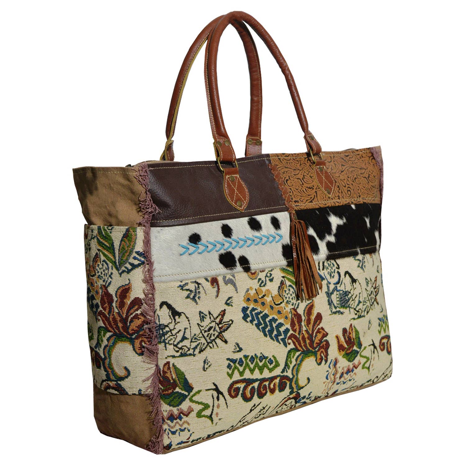 A true fusion of textures and colors composed from multi-patches of cotton fabric, hairon, and floral printed leather. The cool front pattern adds a touch of uniqueness to this masterpiece. With a main zipped compartment, a convenient back pocket, and a beautiful inner lining, this bag combines functionality with aesthetic appeal.
