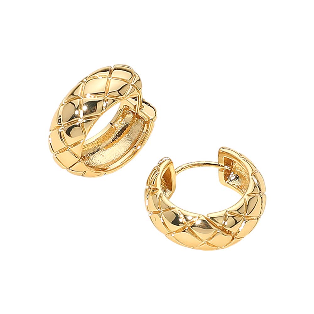 Size : 0.75" X 0.75" X 0.3" Huggie Back Stylish quilt pattern huggie hoop earrings with a bold, textured design that elevates any look. Their compact size makes them ideal for everyday wear while still offering a touch of elegance, blending modern charm with timeless appeal for versatile accessorizing. Brass Gold Dipped Hypoallergenic Lead and Nickel Compliant