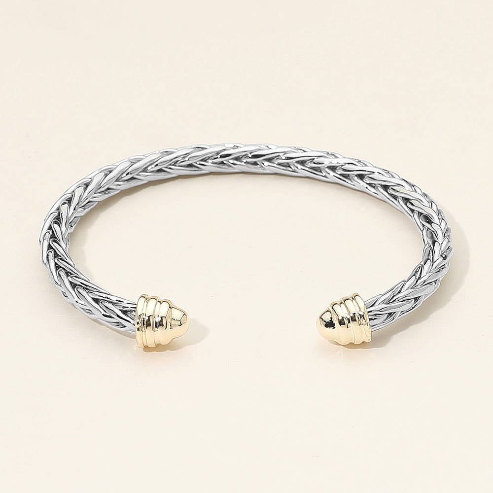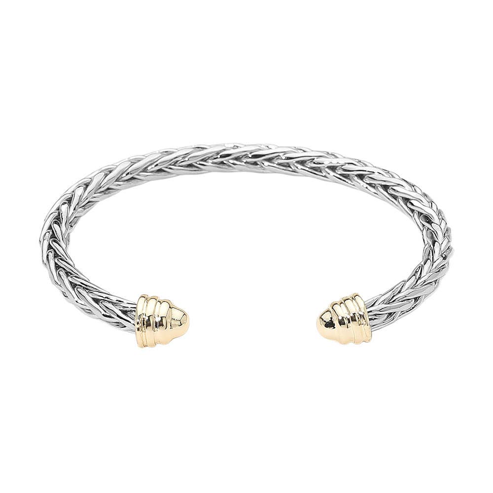This sleek braided cuff bracelet combines timeless craftsmanship with a modern aesthetic. Featuring polished end caps that add a refined finish, it’s designed for effortless style and comfort—perfect for layering or wearing as a statement accessory on any occasion.