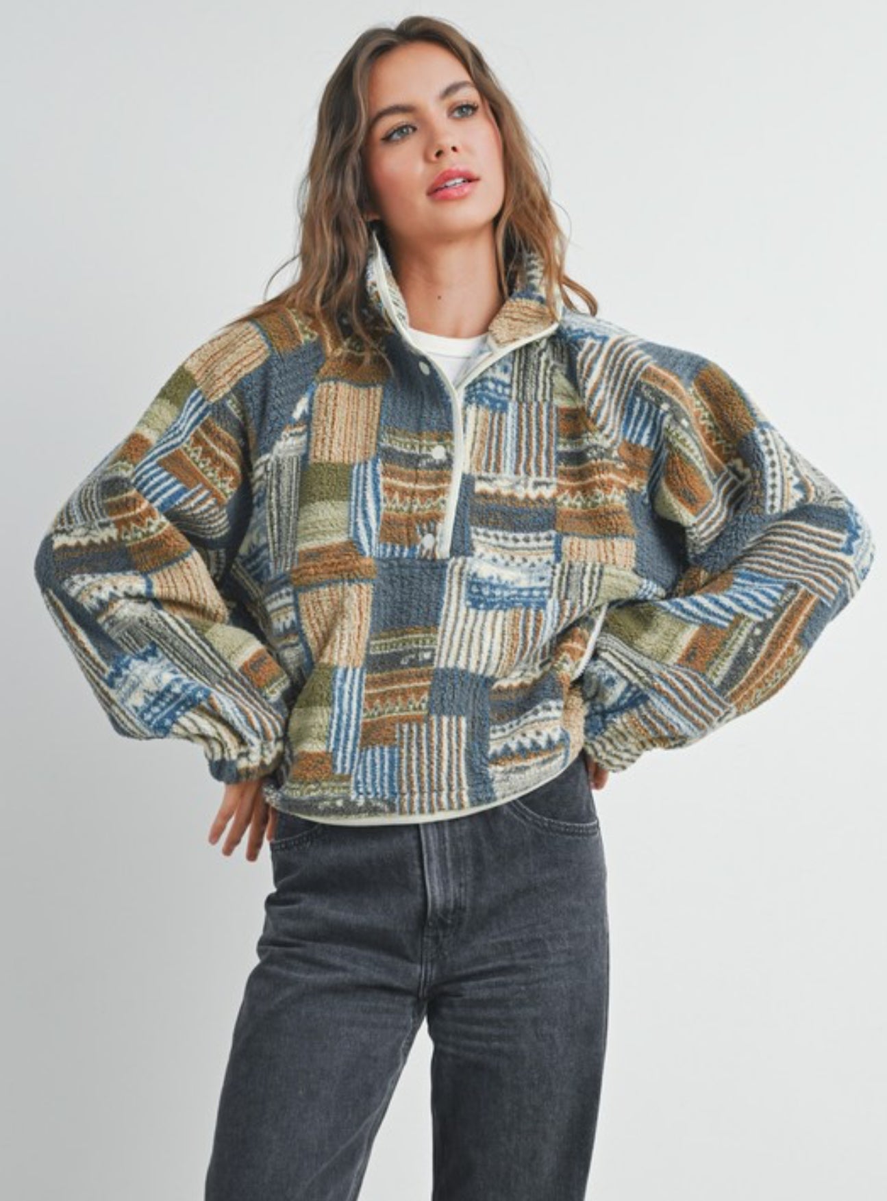 Introducing our Fuzzy Sherpa Jacket - the epitome of comfort and style seamlessly combined to keep you warm and chic throughout the seasons. Crafted with meticulous attention to detail and using only the finest materials, this jacket is designed to elevate your wardrobe while cocooning you in luxurious softness. Model: 5' 9" - B32 - W24 - H34
