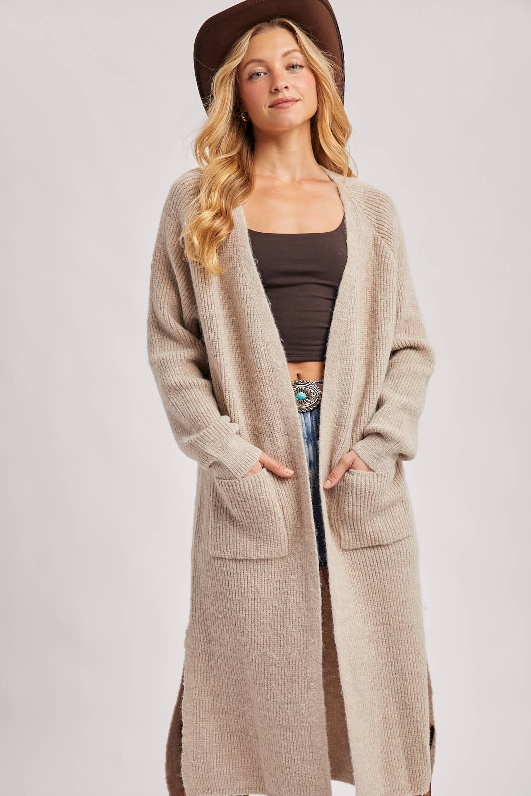 LONGLINE OPEN FRONT SIDE SLIT CARDIGAN: OATMEAL