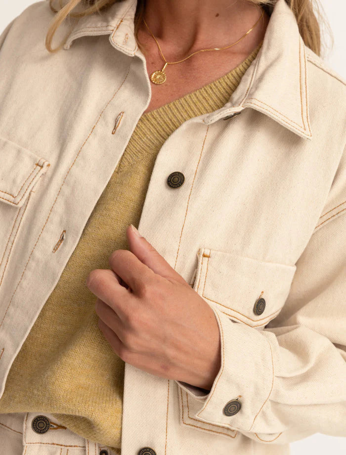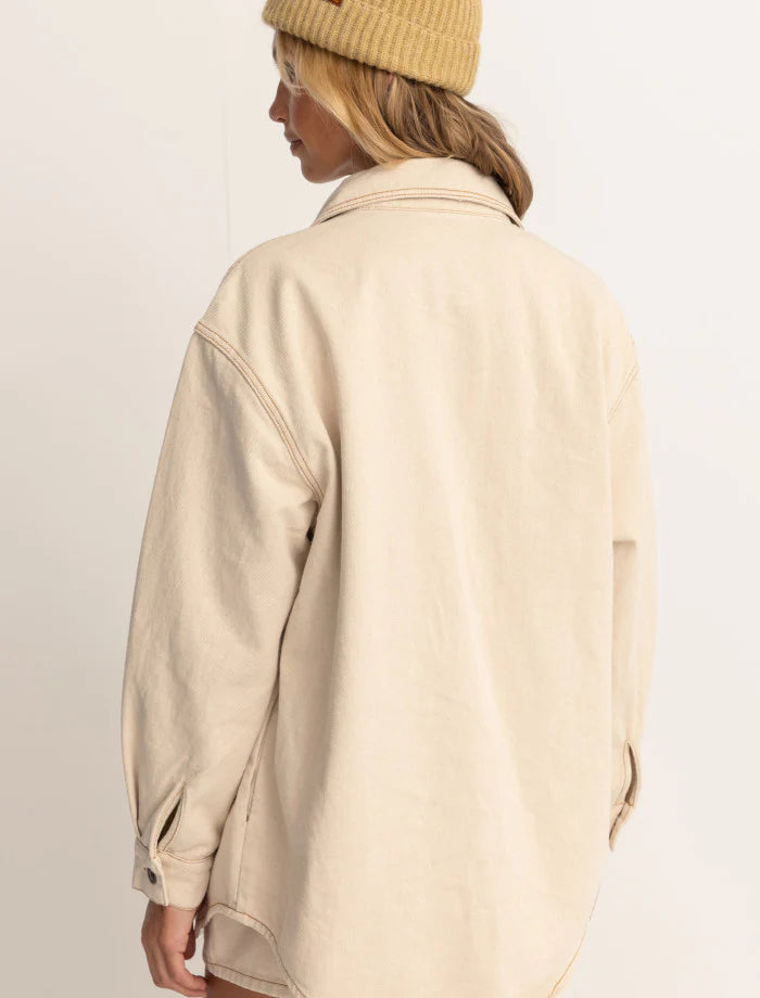 The Claude Drill Shacket is ideal for layering on chilly mornings as you chase the sunrise. Its oversized, warm cotton make it a cozy and stylish choice for all seasons. Now available in a light, loose fit for the celebration of our coastal roots and the dawn of nostalgic surf heritage.