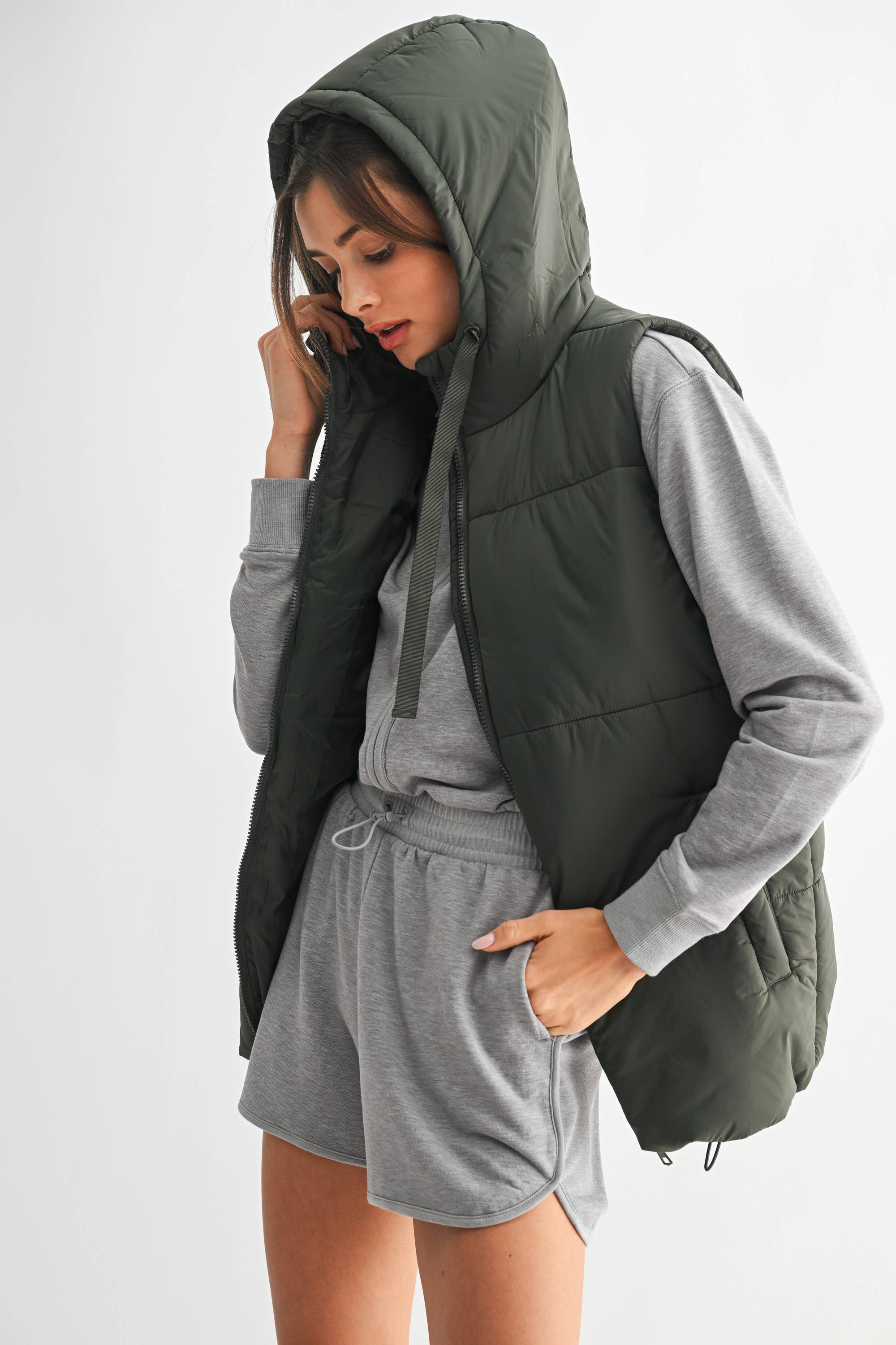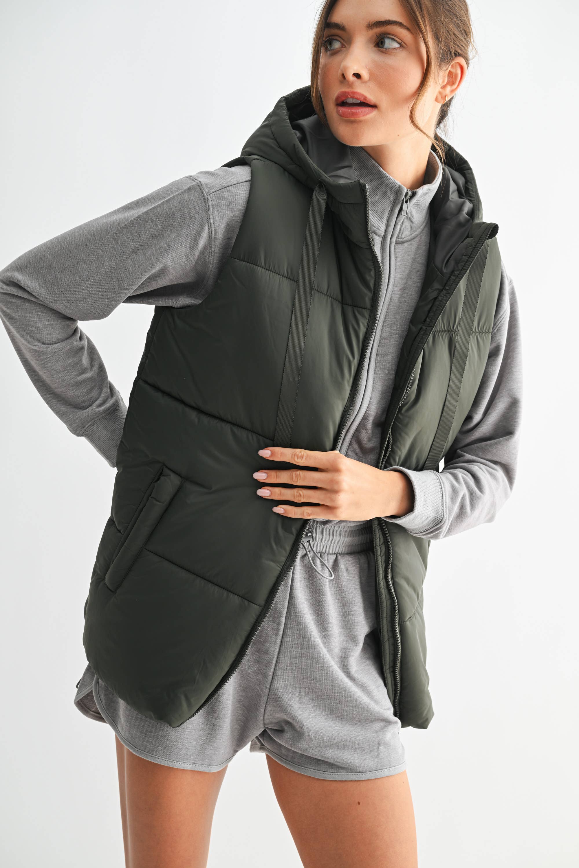 Longline High Neck Padded Vest: OLIVE