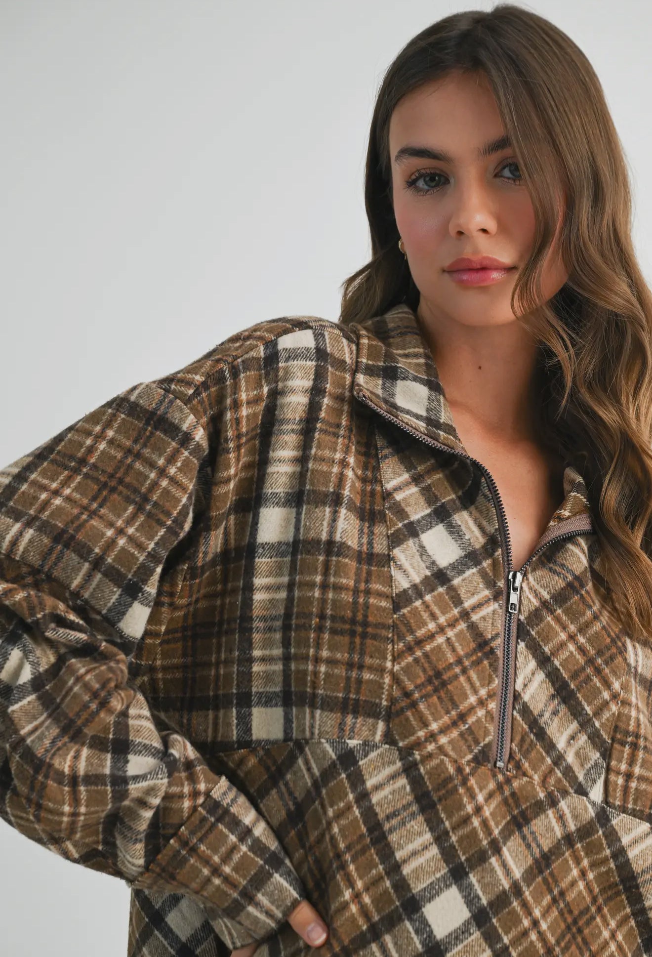 Stay cozy and chic in this oversized Mya plaid pullover, designed with a slouchy fit and versatile zip neckline. Perfect for layering up on crisp mornings or throwing on for laid-back adventures, it’s an instant cold-weather favorite.